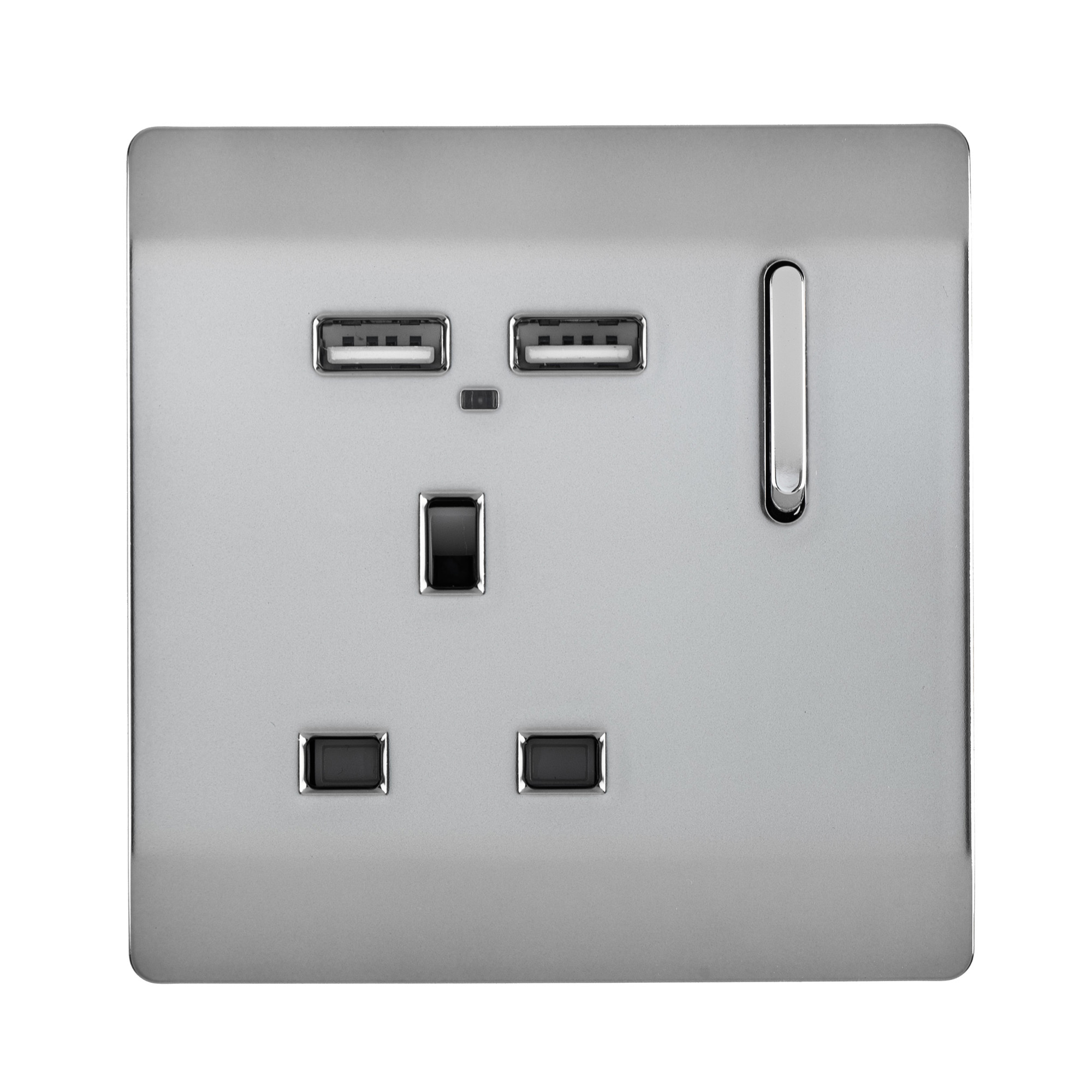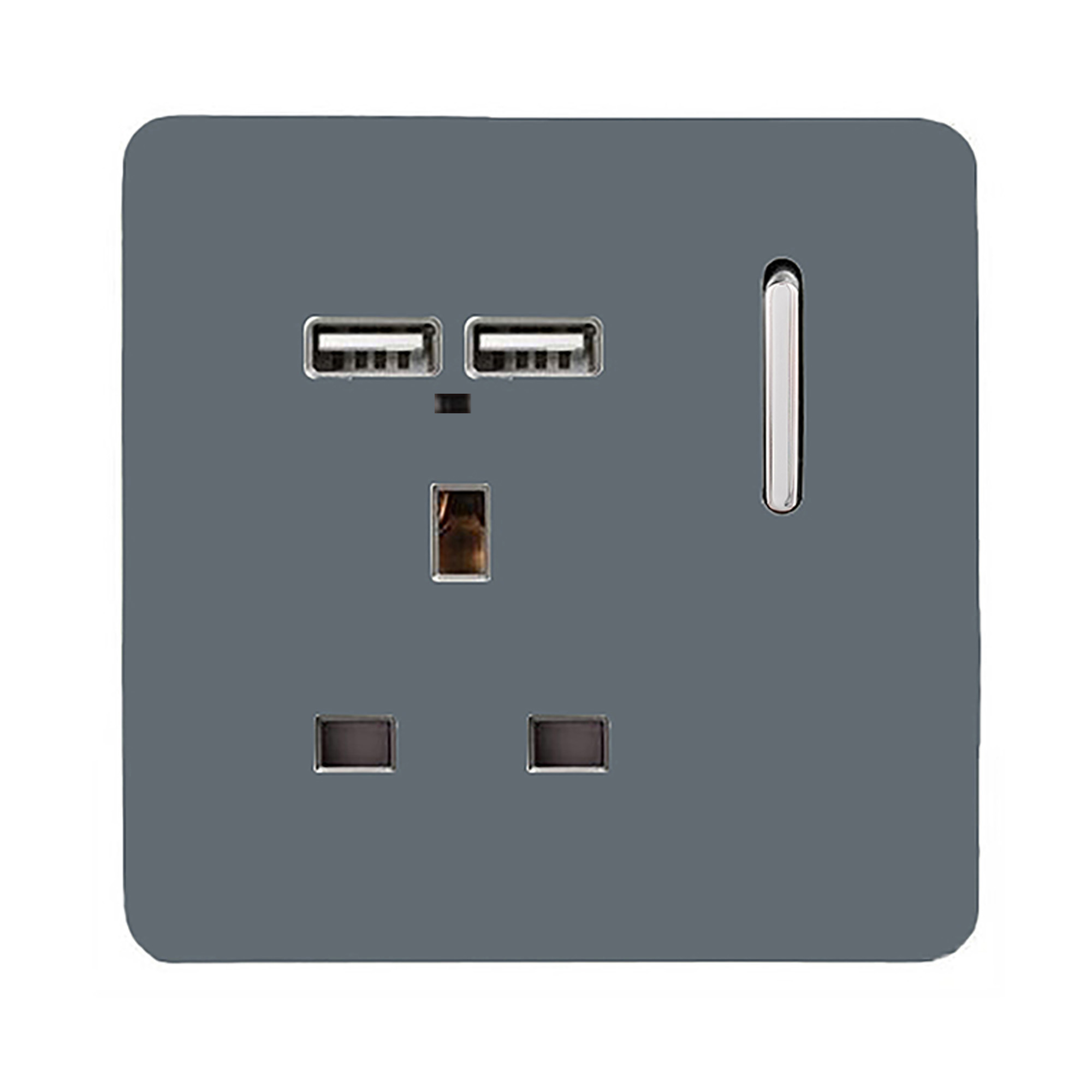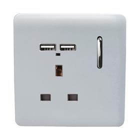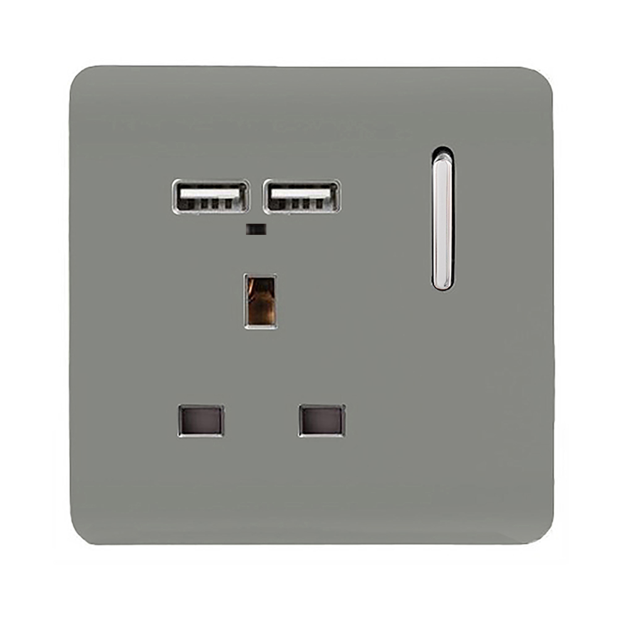 Cool Grey Screwless 1 Gang Switched Single Socket 13A With 2 x USB-A 10W (Shared) With Neon Insert, (35mm Back Box Req.), 10yrs Warranty